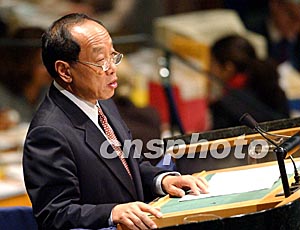 中国外长李肇星九月二十四日在第五十八届联大一般性辩论中发言时表示,为了维护世界和平,促进共同发展,应该加强国际合作,走多边主义道路,促进世界多极化。中新社记者:赵海燕