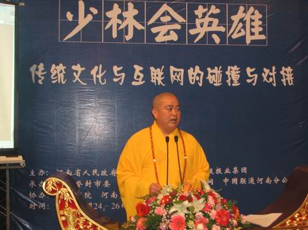 少林寺方丈释永信在少林寺山门前主持盛大的欢迎仪式。释永信在致欢迎词时说:“嵩山论剑--中国互联网新闻宣传高峰论坛在少林寺召开,少林古刹古老的文明和现代科技将在这里碰撞与对接。