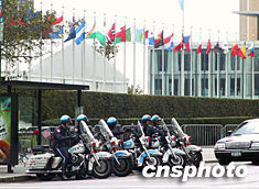 第五十八届联大召开数日来,在联合国总部外待命的纽约警察始终保持着高度警备状态。中新社记者:赵海燕