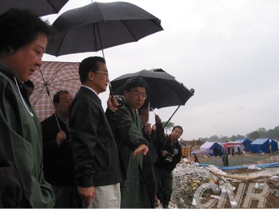离开临时小学,温总理一行又看望了许多住在帐篷里的农民群众。下午4点50分,温总理一行又冒雨登上飞机,飞往安徽灾区。(来源:中广网 作者:记者崔正来、雷恺)