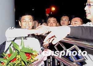 十月四日晚,刚刚抵达北京的中国女子足球队主教练马良行在首都国际机场受到球迷们的热烈欢迎,中国女足虽然没有完成进军前四的预定任务,但她们在场上的拼搏精神依然得到球迷的认可。中新社记者:武仲林