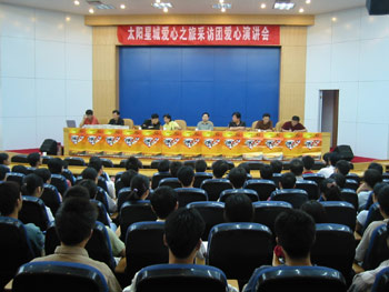 “太阳星城爱心之旅”采访团在合肥工业大学的演讲现场。(华夏时报图 大漠摄)