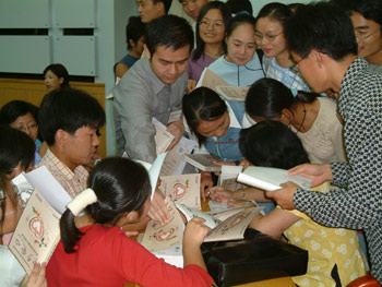 演讲结束后,采访团向合工大赠送了来自民间的思悟录——〈牵手爱心〉,大学生们将“爱心之旅”成员周永琴、赵玉芝、宋体金、李繁民团团围住,请他们签字留念。(华夏时报图 大漠摄)
