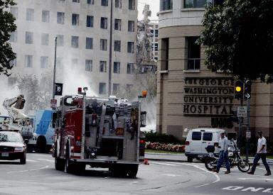 发生大火的街道位于乔治·华盛顿大学医院的新楼和旧楼之间,距离白宫不到一公里。大火发生后,这家医院的工作人员疏散了非急需的工作人员和来访者,并把重点护理病人转移到离大火最远一侧的病房。