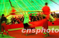 “十一”长假期间,许多游客来到杂技之乡河北吴桥一睹杂技风采。这里除了传统的吴桥杂技外,还增加许多新组合的节目。图中利用云贵民族舞蹈中的细节与杂技蹬凳结合编排的表演,使观众在轻松娱乐中体会杂技高超的技艺。中新社记者:王丽南