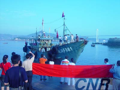 中新网10月11日电 据中广网报道,10月11日早晨7点,搭载两岸三地首次携手保钓行动10名勇士的“闽龙渔F861”号船安全返回厦门东渡渔港。