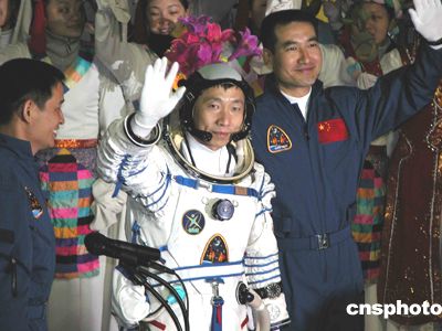 杨利伟随后激动地和翟志刚、聂海胜相互握手拥抱,并频频向欢送的人群挥手致意。