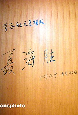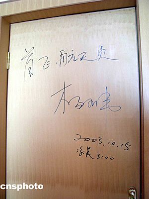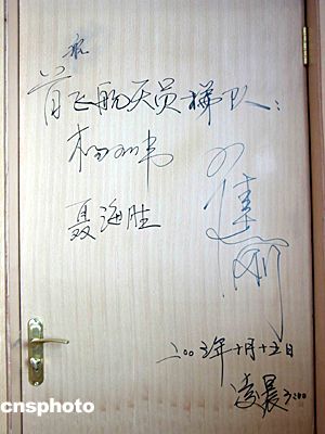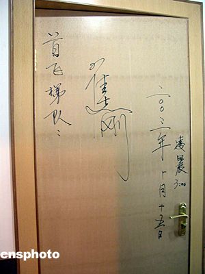 二00三年十月十五日凌晨,中国飞天第一人杨利伟及首飞梯队航天员于“神舟”五号载人飞船发射前,在酒泉卫星发射中心航天员公寓“问天阁”的住房房门上签名留念。中新社记者 孙自法 摄影报道