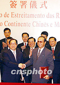 商务部副部长安民与澳门特区政府经济财政司司长谭伯源在仪式上签署了“内地与澳门关于建立更紧密经贸关系的安排”。