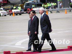 中国国家主席胡锦涛和夫人22日上午10时许抵达悉尼国际机场,对澳大利亚进行国事访问,受到澳联邦总督杰弗里和总理霍华德等热烈欢迎。中新社记者 刘雨生 摄
