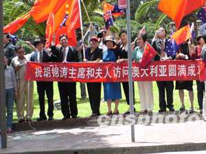 悉尼华人华侨在胡锦涛主席下榻的酒店前迎候。中新社记者 刘雨生 摄