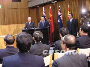 中国国家主席胡锦涛和澳大利亚总理霍华德10月24日在联邦大厦联合会见中澳记者。中新社记者 刘雨生 摄