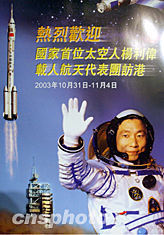中国首位航天员杨利伟载人航天代表团十月三十一抵香港进行访问,为欢迎国家首位航天员杨利伟的到来香港贴出醒目海报。中新社记者:钱兴强