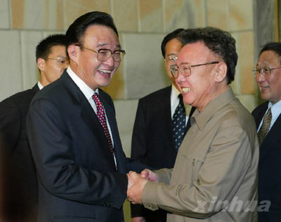 中新社平壤十月三十日电(记者景笑林)朝鲜劳动党总书记、国防委员会委员长金正日今天在平壤会见了正在此间访问的中共中央政治局常委、全国人大常委会委员长吴邦国。双方就朝鲜半岛核问题进行了讨论,并原则同意继续六方会谈进程。