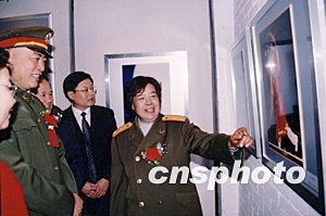一百一十周年邵华舞台艺术摄影作品展,十一日在山东省城济南东方艺术馆举行,毛泽东的儿媳妇邵华(右一)少将向来宾介绍作品。作者:郝帆