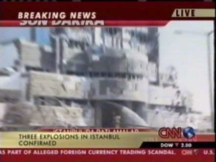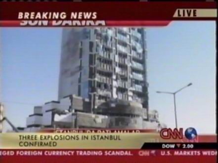 北京时间11月20日下午,位于土耳其伊斯坦布尔北部的土耳其汇丰银行总部附近发生两次爆炸,部分银行建筑被摧毁。此后英国驻伊斯坦布尔领事馆以及一个居民区和一座清真寺也遭到袭击。图为爆炸中被损毁的汇丰银行。(春风)