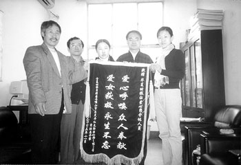 昨天上午,阳光明媚,华夏时报社《华夏爱心团周刊》编辑室内更是暖意融融。由华夏爱心团用爱心呼唤社会奉献救助的怪病少女宋丽娜面带微笑,心揣谢意,和父亲宋洪立一道送来了一面锦旗,表达父女俩内心的真挚情感:爱心呼唤众人奉献,爱女获救永生不忘。