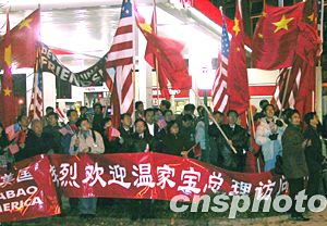 华盛顿侨界9日夜在温家宝总理演讲会场外集会,高呼“国家统一,反对分裂”口号。中新社记者:余东晖