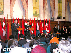 会谈后,两国总理在议会大楼议会阅览室出席了《中华人民共和国交通部与加拿大运输部公路、水路交通技术合作谅解备忘录》等七个双边合作文件的签字仪式并共同会见了记者。温家宝高度赞扬了克雷蒂安总理在他十年任职期间为发展中加两国友好关系所做出的贡献,并期待着与候任总理马丁进一步充实和深化中加全面合作伙伴关系。