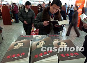 十二月十四日,一名顾客在北京西单图书大厦翻阅最新出版的《毛泽东传(1949——1976)》。为纪念毛泽东同志诞辰110周年,该书本月中旬开始在全国发行,中共中央文献研究室撰写和编辑了此书。中新社记者:张炜