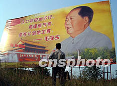 国道三二三线广东韶关南雄市城区南面路边,新近竖起了一块大型毛泽东语录牌。一九五七年三月,毛泽东在最高国务会议第十一次会议上说:“要提倡节育,要有计划地生育。”作者:冯昶