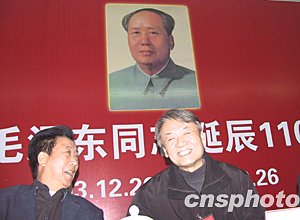 在毛泽东诞辰一百一十周年之际,韶山迎来毛泽东弟弟毛泽民之子——毛远新。毛远新是哈尔滨军事工程学院的高才生,一九七五年在毛泽东病重期间出任其联络员,负责向中共中央政治局传达毛泽东的指示。一九七六年入狱,一九九三年刑满出狱后到上海汽车工业质量检测研究所工作,二零零一年退休。图为毛远新(右)出席韶山市纪念毛泽东诞辰一百一十周年座谈会。作者:殷敏鸿