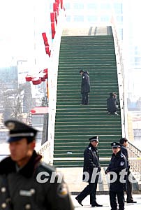 二月九日,北京有关专家在元宵灯展发生特大伤亡事故的密云县密虹公园彩虹桥上进一步展开调查。中新社记者:盛佳鹏