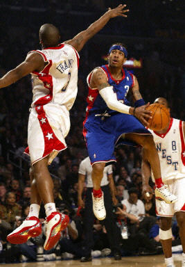 洛杉矶湖人队的艾弗森在对战西部全明星队的弗朗西斯,两名小个子球员上演空中舞蹈。
