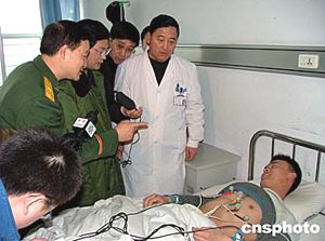 二月十五日十一时许,吉林市中百商厦发生火灾。截至十六日上午,已知有五十三人丧生,另有七十人受伤被送往医院接受治疗。图为国家安全生产监督管理局和公安部消防局有关人员到医院看望救火中受伤的消防队员。作者:吴兆飞