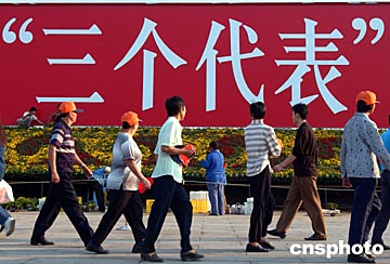 十届全国人大二次会议三月十四日对宪法修正案草案进行表决,“三个代表”重要思想正式写入中国新宪法。图为北京天安门广场上的“三个代表”巨幅标语牌。中新社记者:张炜