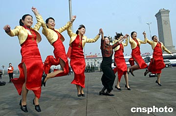 三月十四日,十届全国人大二次会议在北京闭幕,为“两会”服务的礼仪小姐们在天安门广场快乐“起舞”。中新社记者:张勤