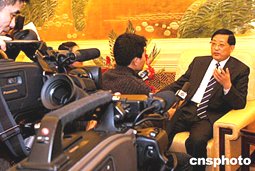 沈阳市长陈政高在北京人民大会堂接受记者采访,介绍东北老工业基地经济振兴问题。中新社记者:王丽南