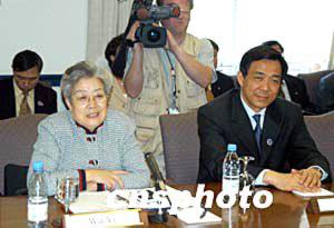 中国国务院副总理吴仪(左)和商务部部长薄熙来(右)四月二十一日出席在美国华盛顿举行的第十五届中美商贸联委会。作者:余东晖