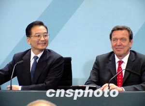 正在德国访问的中国总理温家宝三日下午和德国总理施罗德进行会谈,并发表了中德联合声明。图为两国总理在会谈后联合举行记者招待会。作者:蔚中