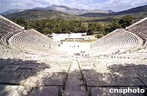 神话、史诗、戏剧是古希腊的重要文明,伯罗奔尼撒半岛东南方的埃庇达洛斯剧场为公元前四世纪所建,呈圆扇面形,共有55层座位,每层两阶梯,可容纳14000人。其音效奇佳,在圆心处低语或掉下一块铜币,坐在最后一排也能听得真切。作者:田地
