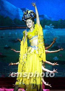 5月7日晚,陕西西安唐乐宫文艺工作者为游客表演代表中国盛唐文化的霓裳羽衣舞,为作为六朝古都的西安旅游助力。中新社记者:武仲林
