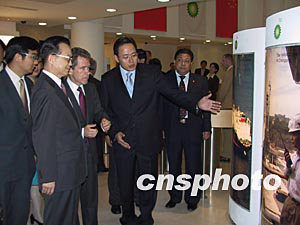 正在英国访问的温家宝总理9日下午前往英国石油公司参观,正在听取该公司总裁布朗勋爵介绍中英石油合作项目情况。朱大强 摄