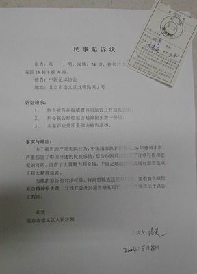 目前,他已聘请了知名律师,写好了起诉状书,要求法院判决中国足协赔偿他一分钱的精神损失费,“我已经于8日下午向北京市崇文区人民法院立案庭以挂号信的方式递交了起诉书!”