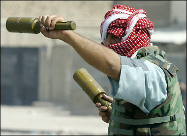 据法新社报道 在巴格达什叶派社区萨德尔城,一名效忠于什叶派宗教领袖萨德尔的民兵正拿着两个拄型手榴弹站在萨德官邸附近。(固山)