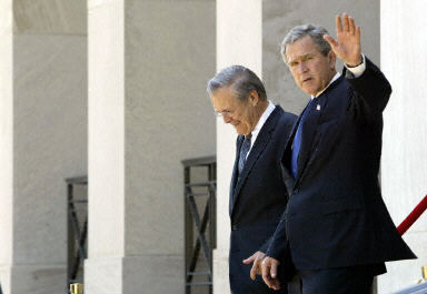布什称赞拉氏说,拉姆斯菲尔德在美国进行的反恐战争中领导有方,他的表现杰出,是强有力的国防部长,当得起美国人民的感谢。