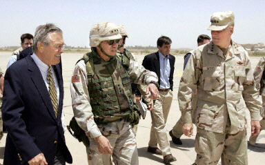 中新网5月13日电 美国国防部长拉姆斯菲尔德和美国参联会主席迈尔斯13日抵达巴格达,对伊拉克展开“闪电式”访问。