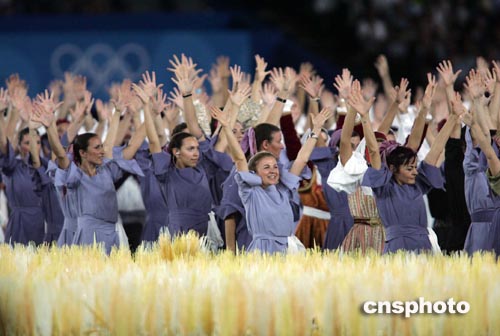 在由四万五千多片金黄的麦穗装点的舞台上,伴随希腊传统音乐和特色民歌,在色彩斑斓的玻璃马赛克铺就的道路上,人们翩翩起舞,展示着雅典人收获的喜悦,表达他们对奥运会的祝福。
