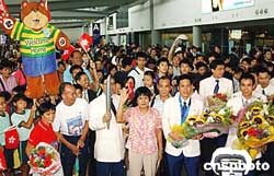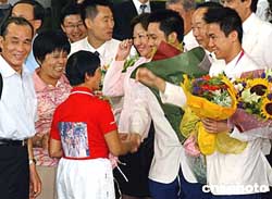 代表团今天中午返抵机场,雅典奥运赢得乒乓球男双银牌的高礼泽及李静亦随队抵港,三百多名热爱乒乓球的小朋友,获安排到机场迎接,高礼泽及李静的父母,以及民政事务局长何志平、康文署长王倩仪等官员,亦到机场迎接。