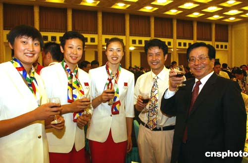 今晚的招待会上,在雅典奥运会上取得骄人战绩的中国奥运体育代表团的运动员教练员们、中国奥组委工作人员和随团采访的新闻媒体工作人员齐聚一堂,分享胜利喜悦。