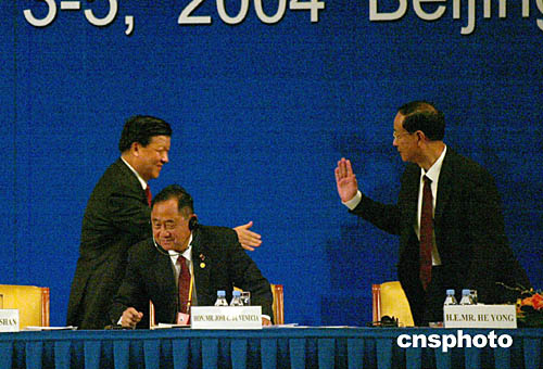 中共中央书记处书记刘云山(左)、中共中央对外联络部部长王家瑞出席第三届亚洲政党国际会议闭幕式。