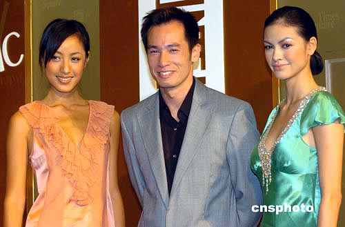 香港艺员陈豪(中)与名模蒋怡(左)﹑Rosemary14日出席香港时代广场“时代b2”开业仪式。