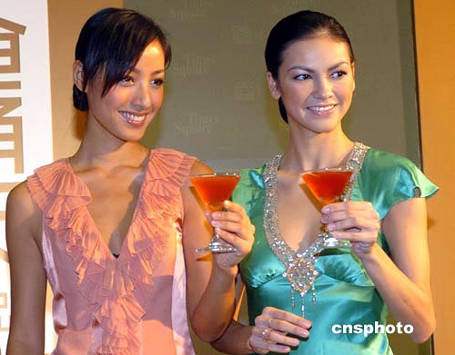 香港名模蒋怡(左)﹑Rosemary14日出席香港时代广场“时代b2”开业仪式。作者:赵振清