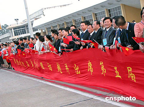 十月六日傍晚,中国总理温家宝抵达河内开始对越南正式访问。中国驻越使馆工作人员、华侨、留学生手持国旗,打出横幅热烈欢迎温家宝总理访问越南。作者:吴庆才