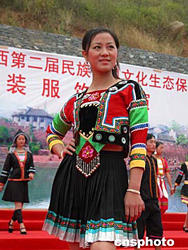 湖南省民族民间文化艺术博览会暨湘西第二届民族民间文化生态保护艺术节于十月四日至七日在湘西举行。在凤凰南长城,三十名大学生模特身着土家族、苗族、白族、侗族等八大少数民族的服装服饰,穿插民族歌舞全面展示了少数民族浓郁的服饰文化。图为选手在向游客展示侗族服饰。作者:刘双双
