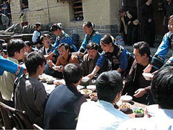 十一黄金周期间,充满神秘色彩的湘西游客络绎不绝。美丽的风光和浓郁的民族文化让游客流连往返,尝尝美味的农家饭自然是不可少。图为苗家姑娘唱着山歌为游客送上醇香的自制米酒。作者:刘双双